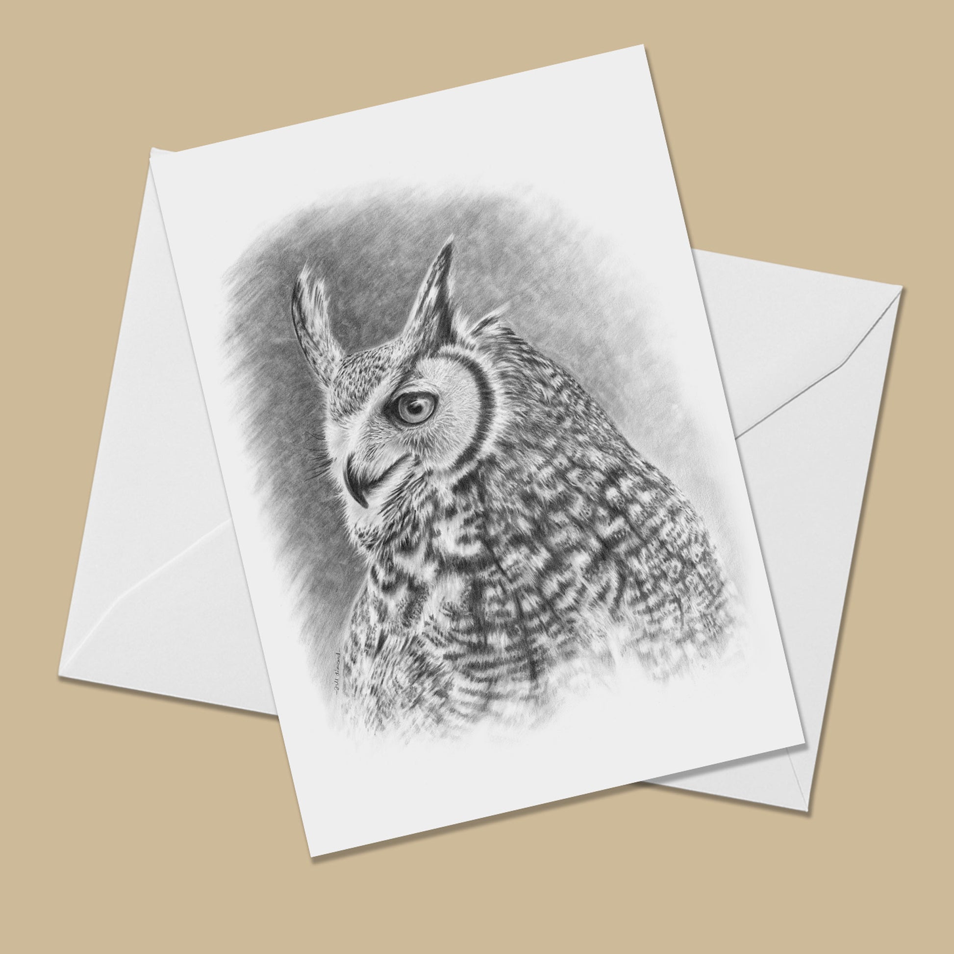 Send a stunning greeting card featuring the amazing great horned owl, beautifully hand drawn in pencil by Jill. (Bubo virginianus) The perfect card for any bird of prey lover! Great for birthdays - or any occasion for that matter!