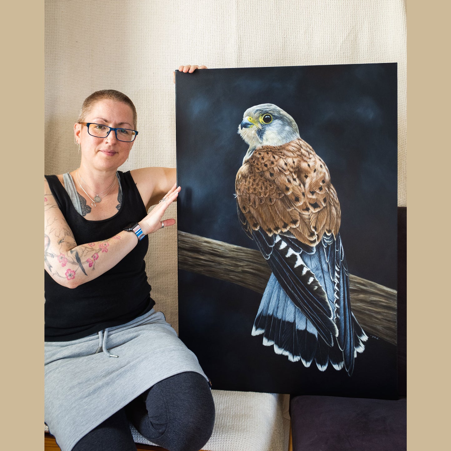 - A piece of original bird art, featuring an amazing male common kestrel (falco tinnunculus), painted in acrylics on 36x24" canvas by British bird artist Jill Dimond.