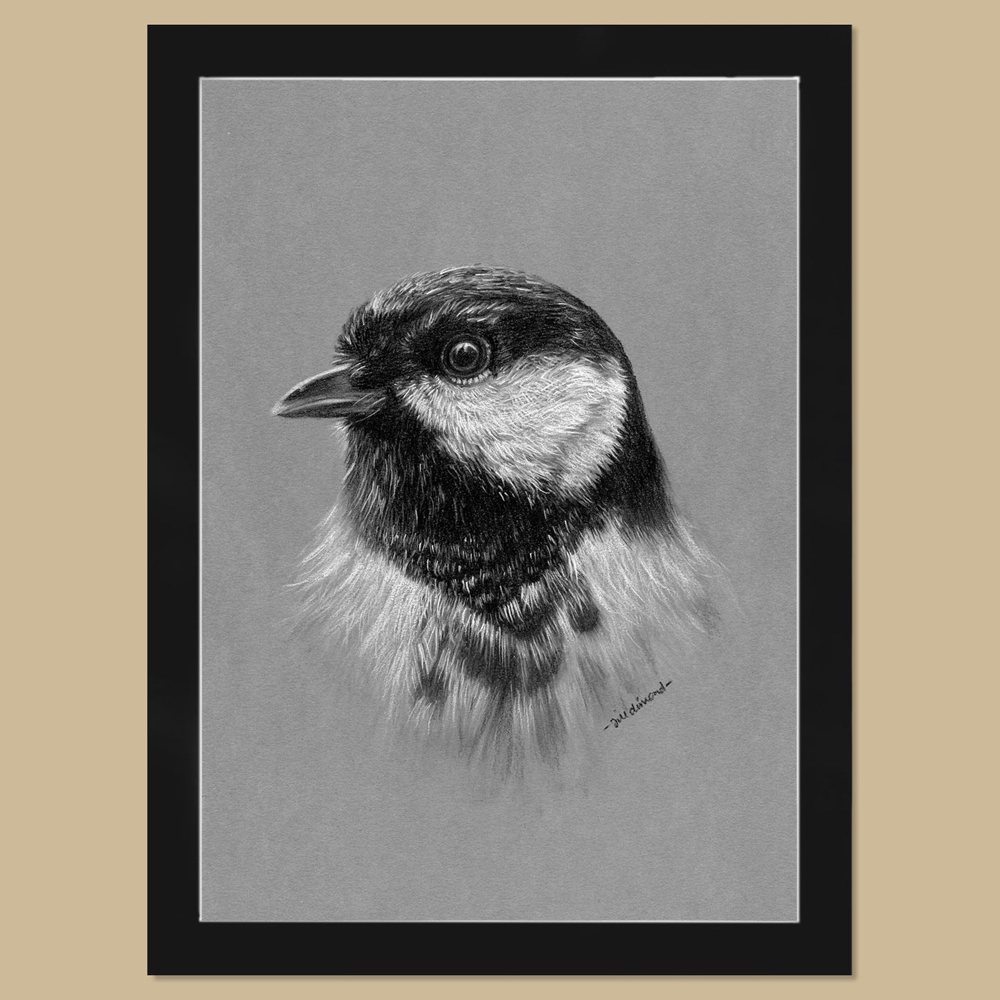 You might well find this little guy in your garden - the great tit! And what a handsome little bird he is. He was drawn on toned paper using charcoal and white charcoal by Jill. Wouldn't you just love his sweet face looking at you every day from your wall? Here's what you get: